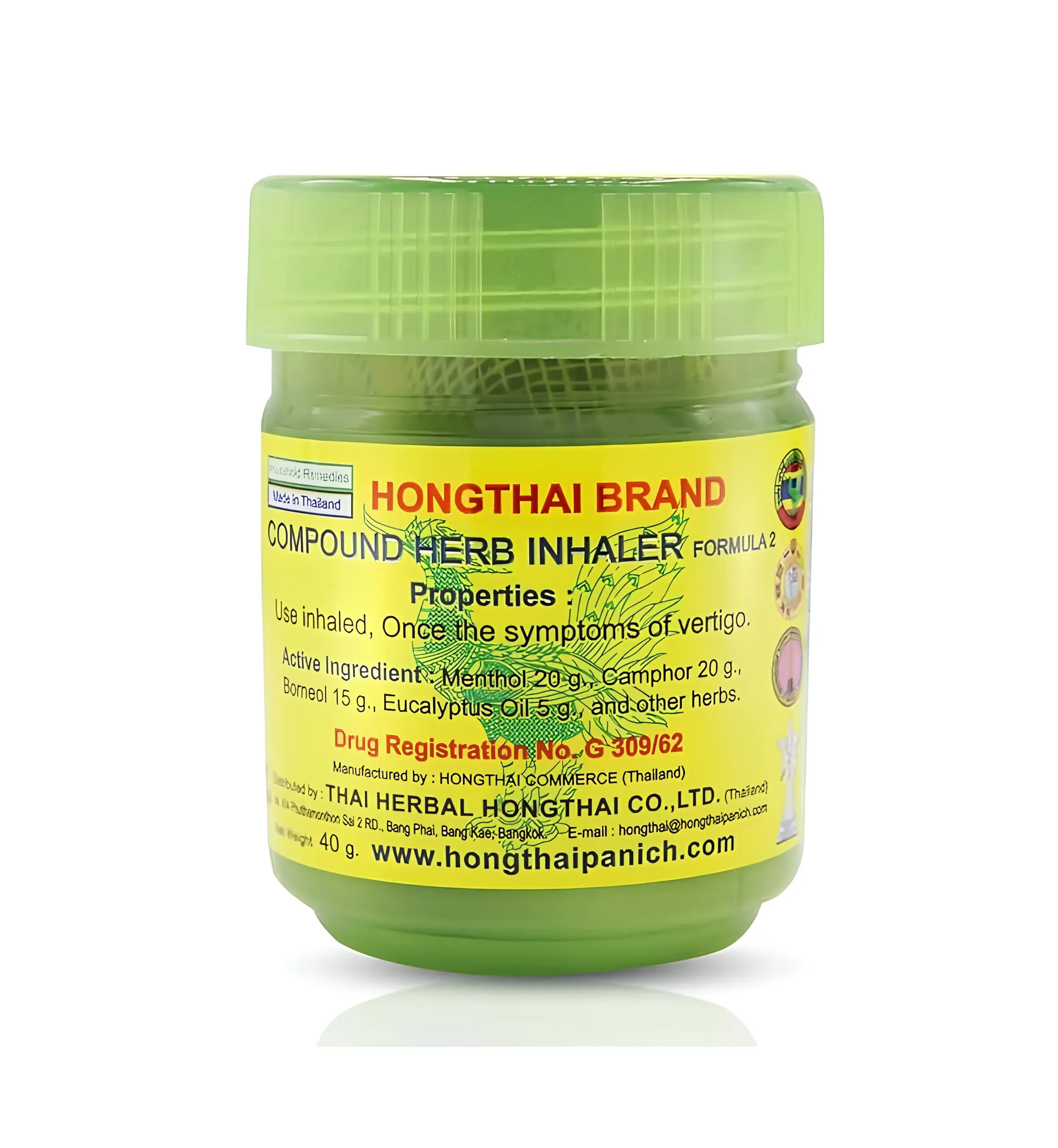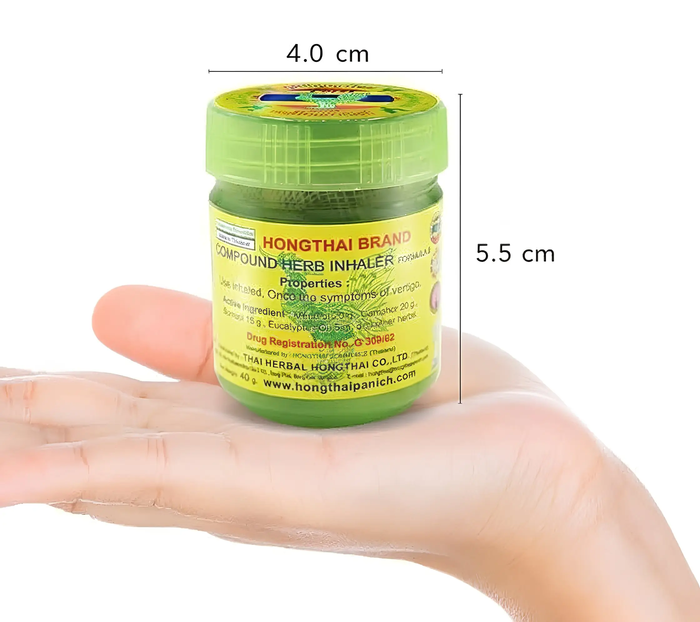 A Hong Thai gyógynövényes inhalátor egy 5,5 cm magas és 4 cm átmérőjű doboz, 60 grammnyi hatóanyaggal (nyersen), összesen 40 gramm súllyal.
