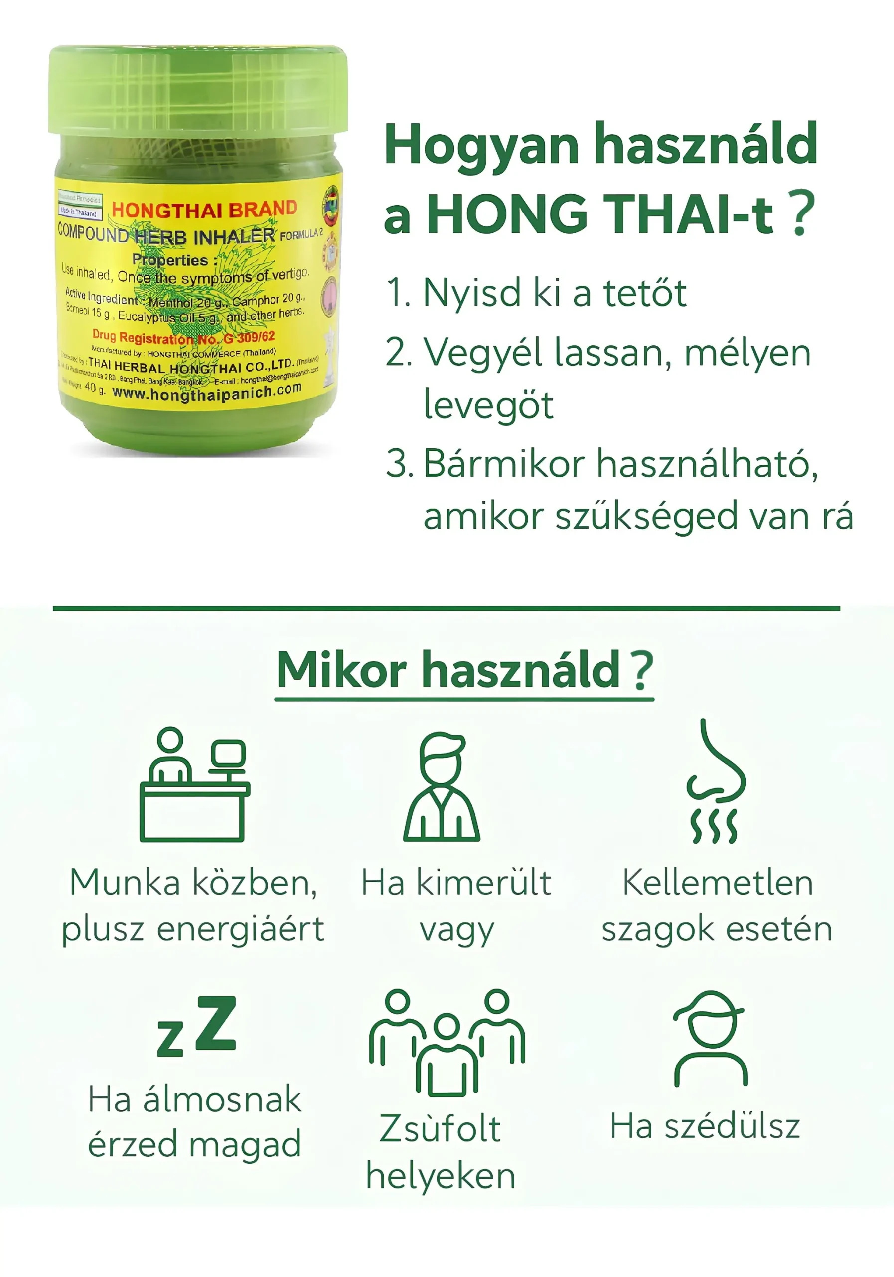 Kimerültnek érzed magad, elnehezült a fejed, vagy alig kapsz levegőt? Egy mély lélegzet és a Hong Thai gyógynövényes inhalátor azonnal elhozhatja neked a régen vágyott erőt! Összetevői, a thai erdők mélyéről gondosan begyűjtött borneol, kámfor, mentol, eukaliptusz és más organikus hatóanyagok, egymás hatását fokozva emelik új szintre a közérzeted. Segíthetnek megtisztítani a légutakat, felfrissíteni az elmét, enyhíteni a szédülést és csökkenteni a fáradtság érzését. Kompakt méretének köszönhetően bárhová magaddal viheted, így a természet tiszta energiája mostantól mindig ott lapulhat a zsebedben. Szerezd be még ma a terméket!