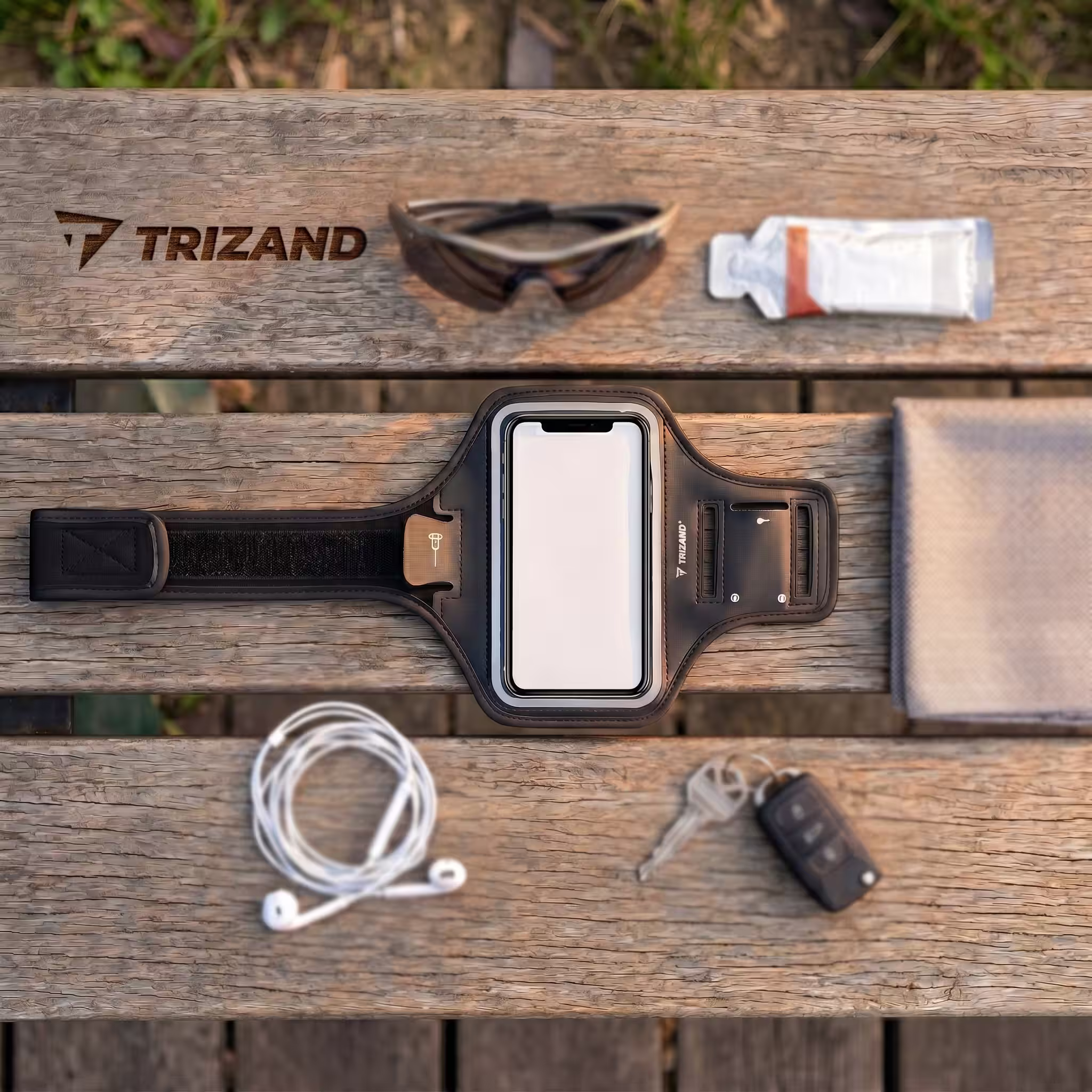 A Trizand karpántos telefontok felülnézetből egy padra helyezve, egyéb kellékek között